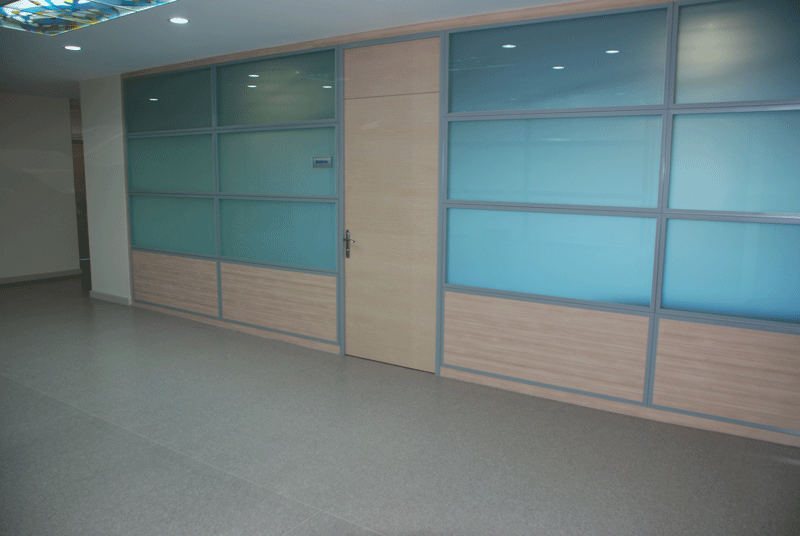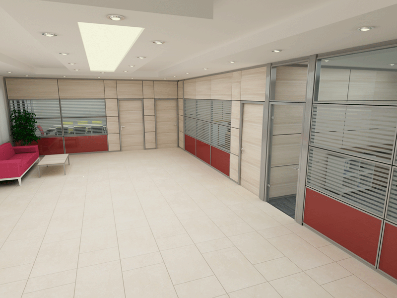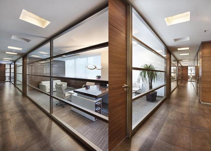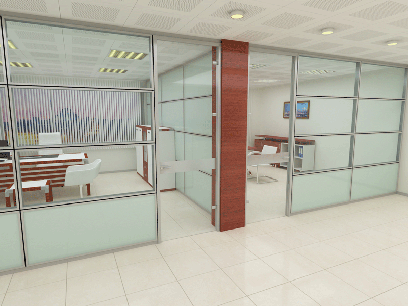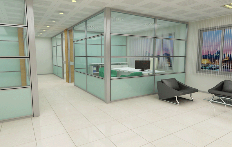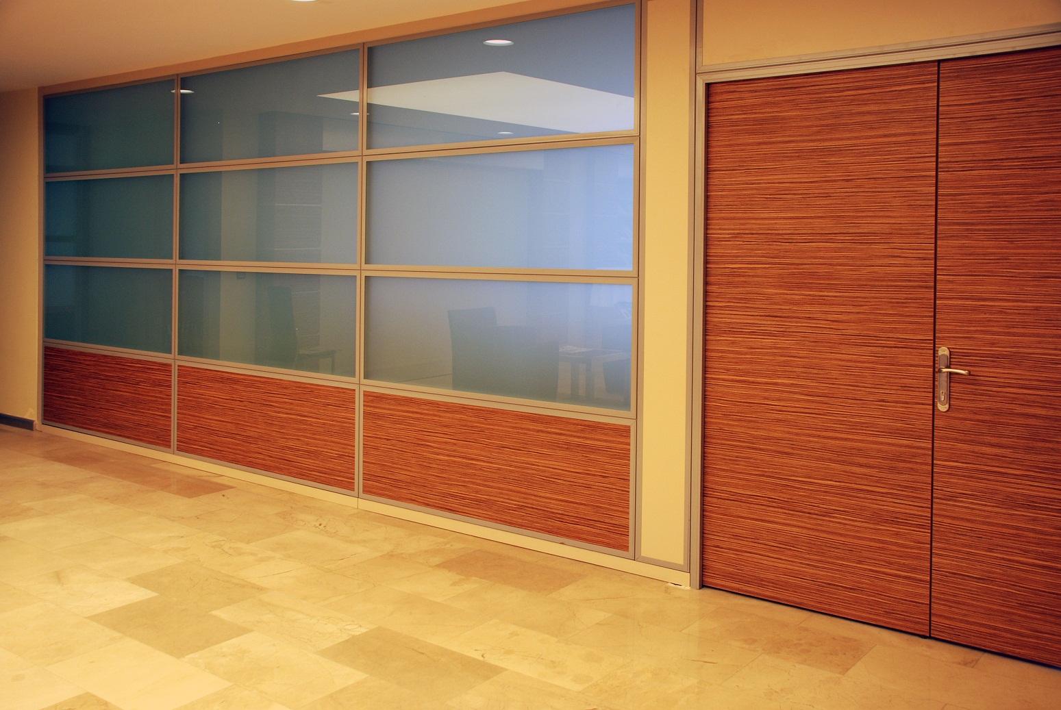 YATAY CAMLI OFİS ARA BÖLME DUVAR :yerden 85 cm’lik kısım dolu, 85 cm ile kapı üst seviyesi arasında kalan kısım camlı, kapı üst seviyesi ile tavan arası dolu panellerle geçilir. Bu sistem ara camlı olarakta adlandırılır.