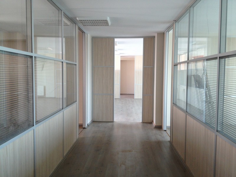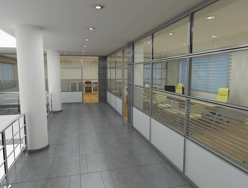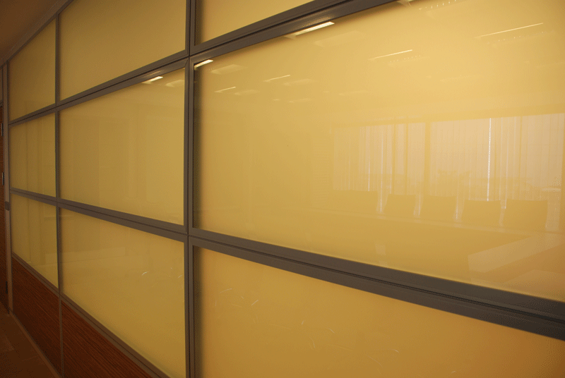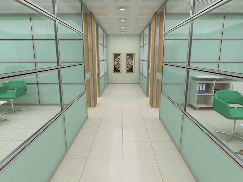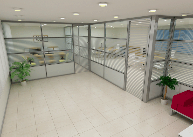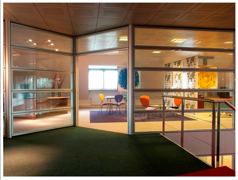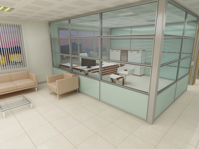 YATAY CAMLI OFİS ARA BÖLME DUVAR :yerden 85 cm’lik kısım dolu, 85 cm ile kapı üst seviyesi arasında kalan kısım camlı, kapı üst seviyesi ile tavan arası dolu panellerle geçilir. Bu sistem ara camlı olarakta adlandırılır.